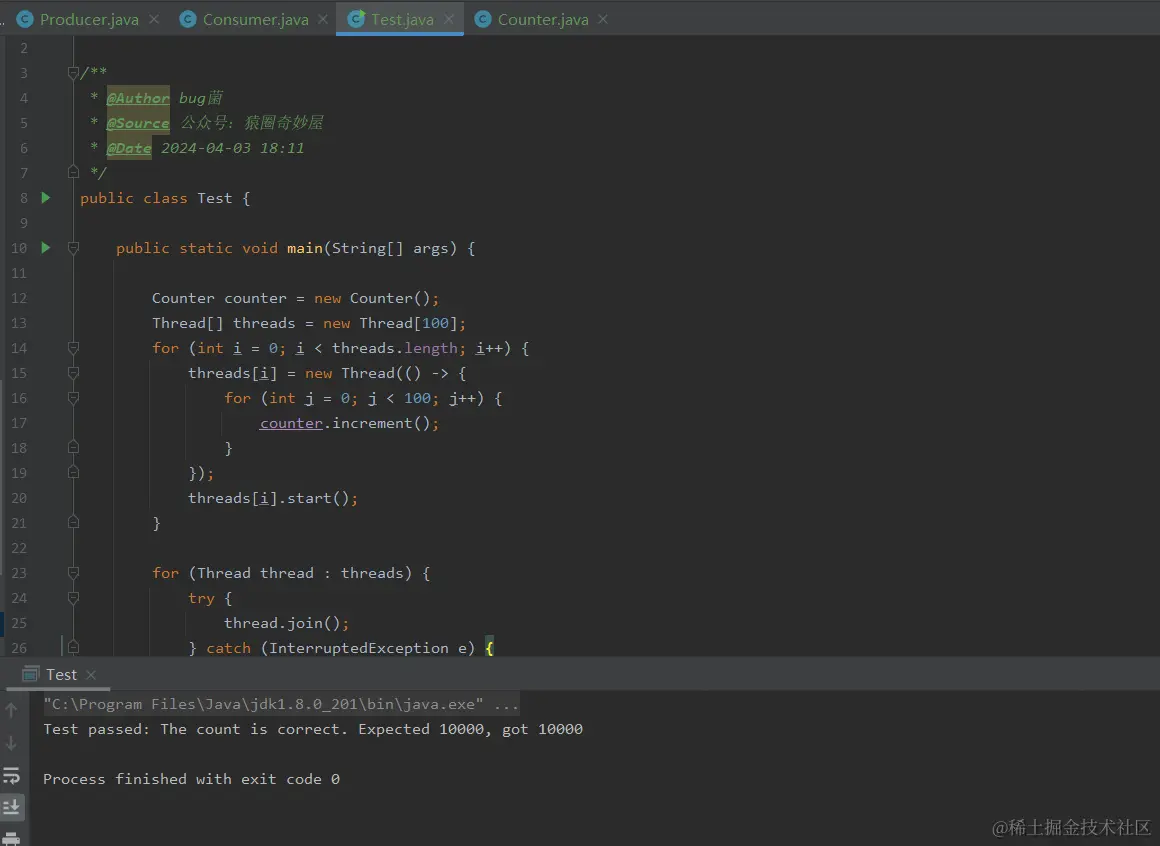 可以看到控制台输出结果,100个线程,每个线程增加100次,预期值与执行结果是一致的:10000,所以输出了这句:Test passed: The count is correct. Expected 10000, got 10000。