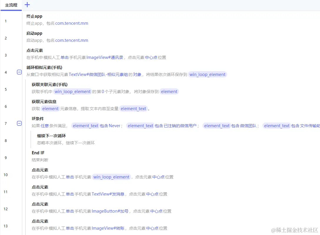 1. 该场景配置花了大概1个小时,主要用到循环相似元素、点击元素、IF元素是否存在,平均判断一个用户17s左右。