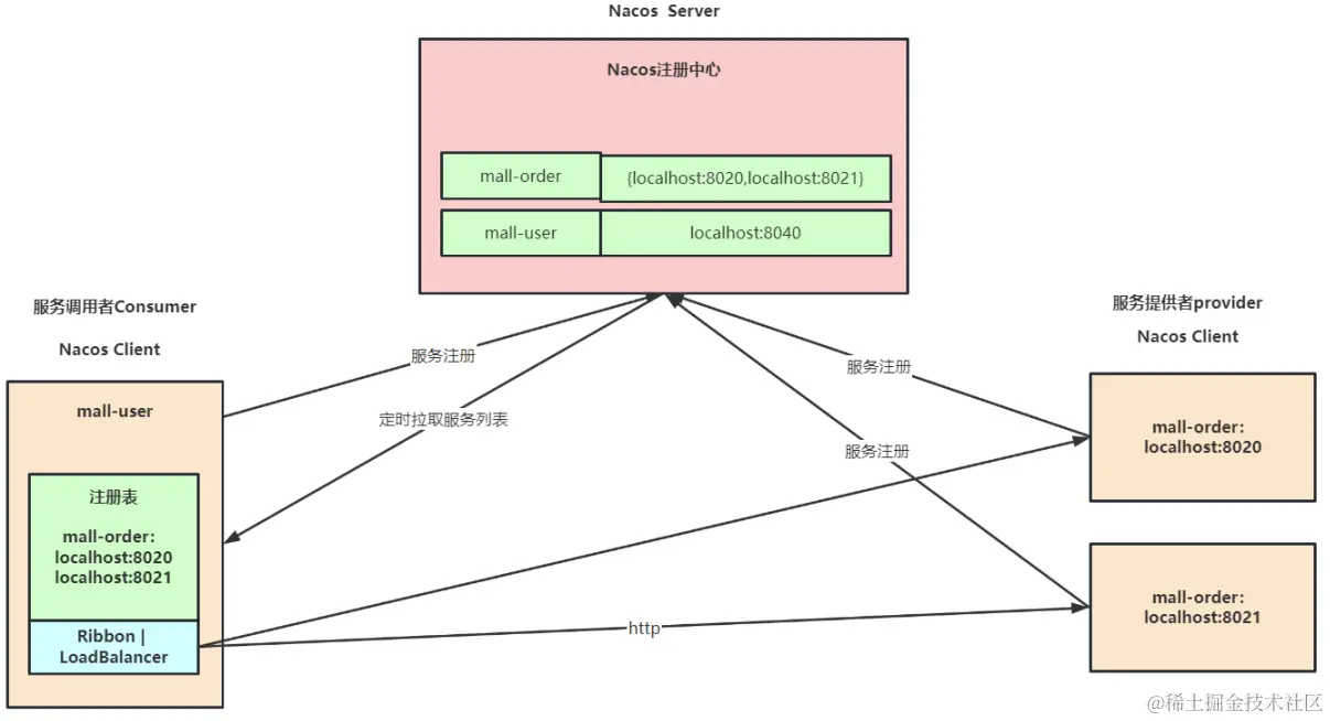 服务发现: 服务消费者(Nacos Client)在调用服务提供者的服务时,会发送一个REST请求给Nacos Server,获取上面注册的服务清单,并且缓存在Nacos Client本地,同时会在Nacos Client本地开启一个定时任务定时拉取服务端最新的注册表信息更新到本地缓存