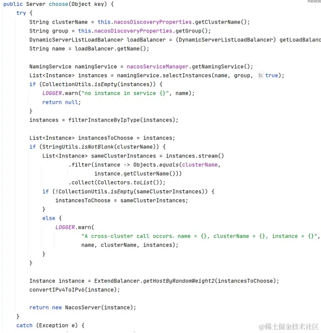 利用cluster-name可以实现跨集群调用时,优先选择本地集群的实例,本地集群不可访问时,再去访问其他集群。 下面是Ribbon的NacosRule实现的负载均衡算法,就是利用了cluster-name实现了优先调用本地集群实例