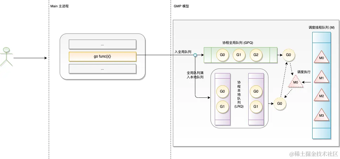 - LRQ 中没有可运行的G,M会尝试从全局队列 (GRQ) 拿一批G放到P的本地队列。