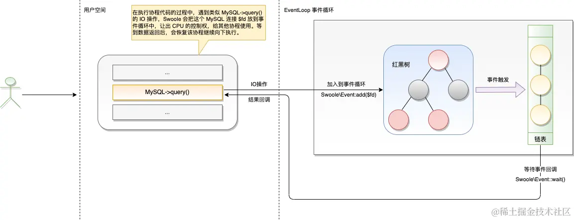 - Swoole 中的协程实现主要是利用了底层的事件循环机制,本质上是使用了 IO 多路复用技术。