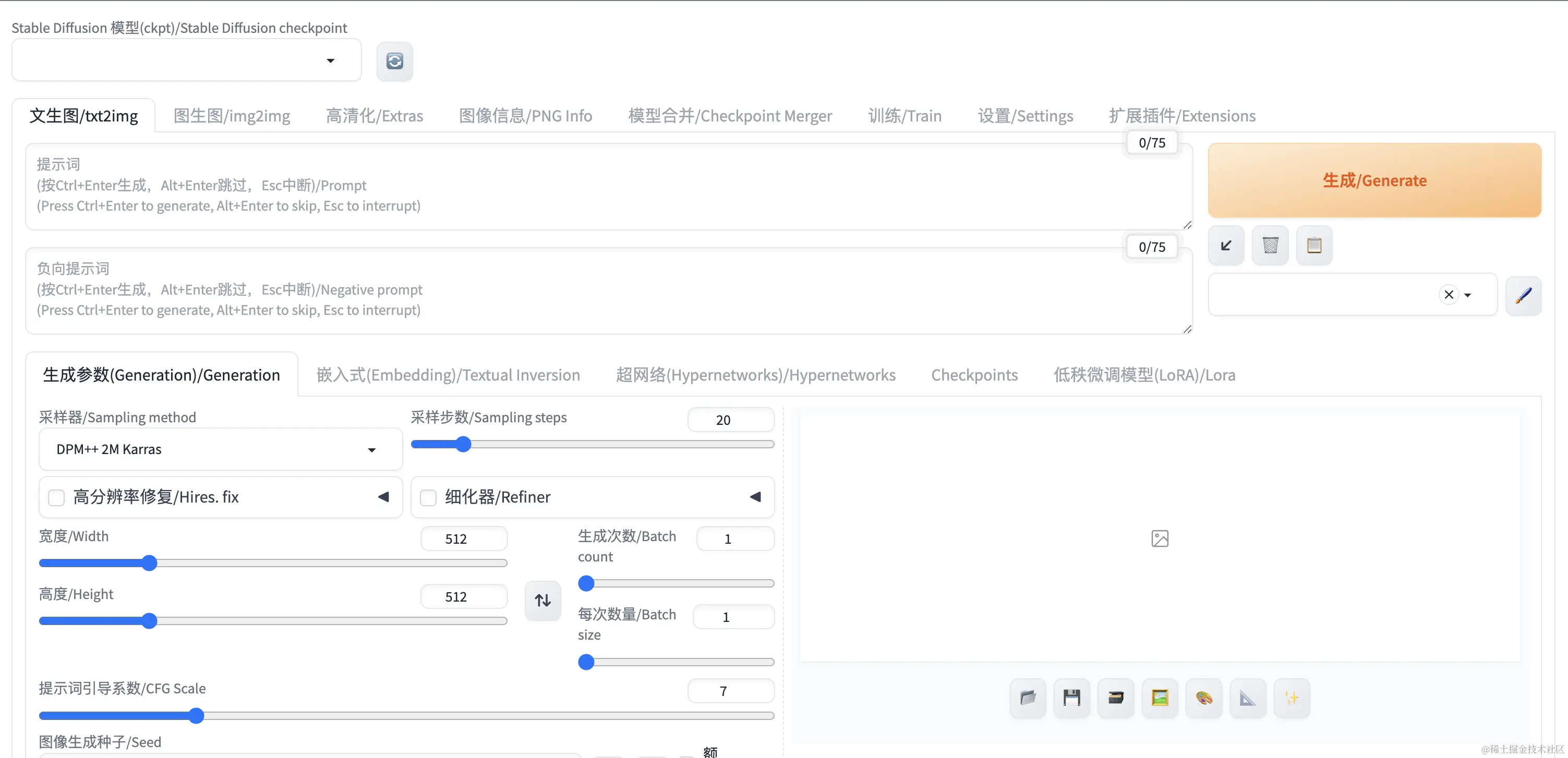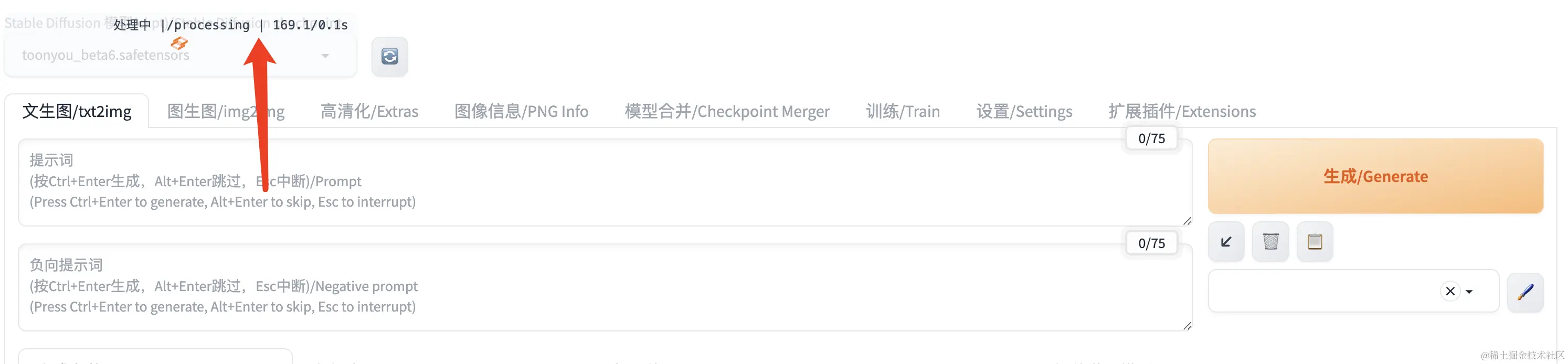 我们尝试在界面选择模型 -> 提示语 -> 点击生成, 等待片刻... 即将完成一副巨作