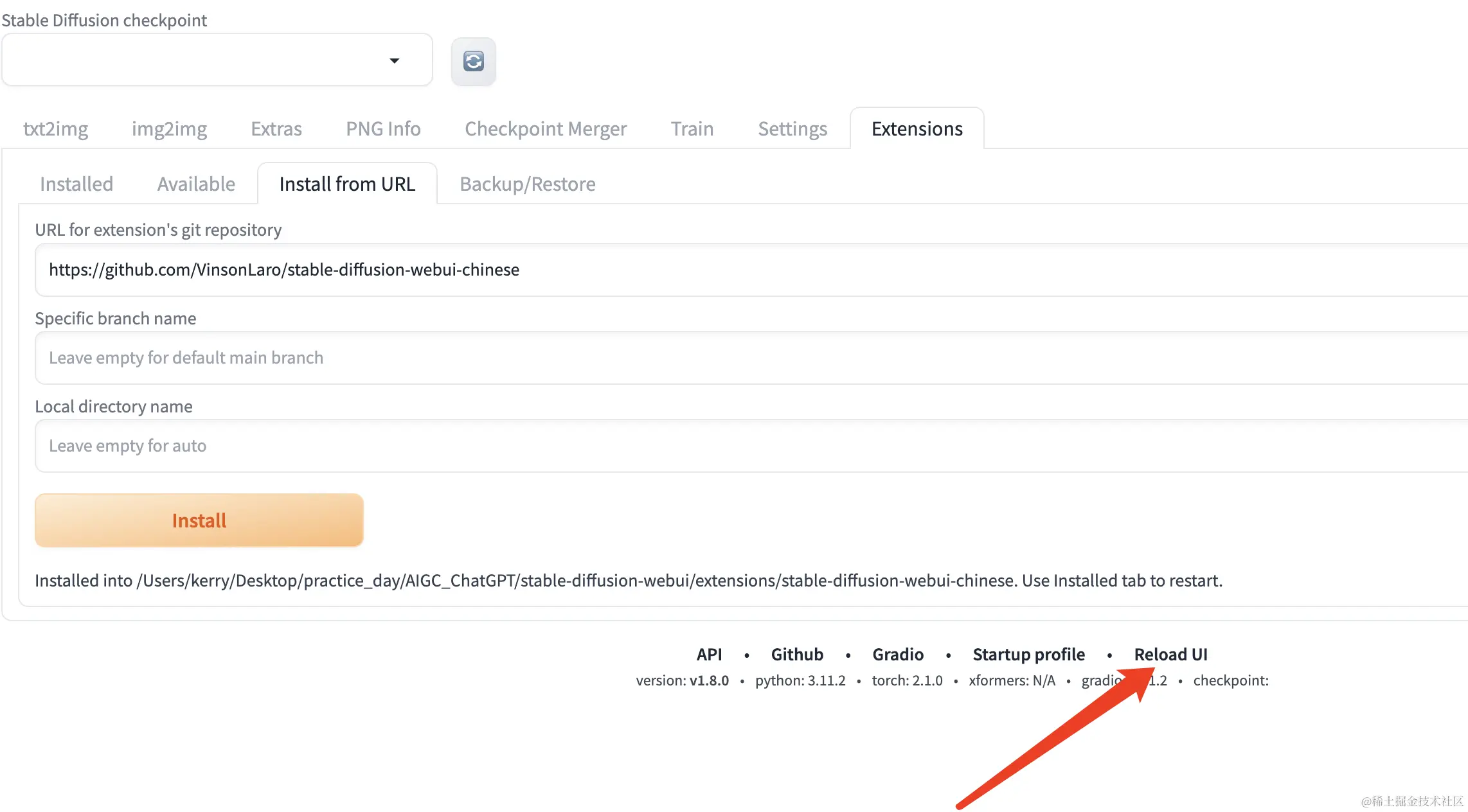 4.点击下方的黄色按钮"Install"即可完成安装,然后重启WebUI(点击"Install from URL"左方的"Installed",然后点击黄色按钮"Apply and restart UI"网页下方的"Reload UI"完成重启)