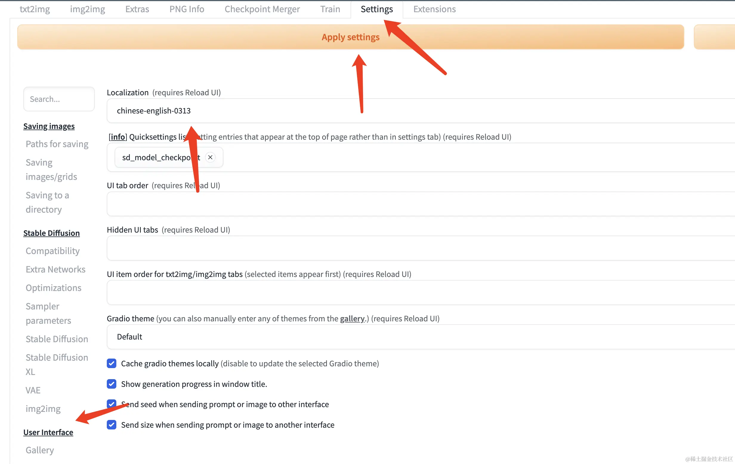 6.点击界面最上方的黄色按钮"Apply settings",再点击右侧的"Reload UI"即可完成汉化