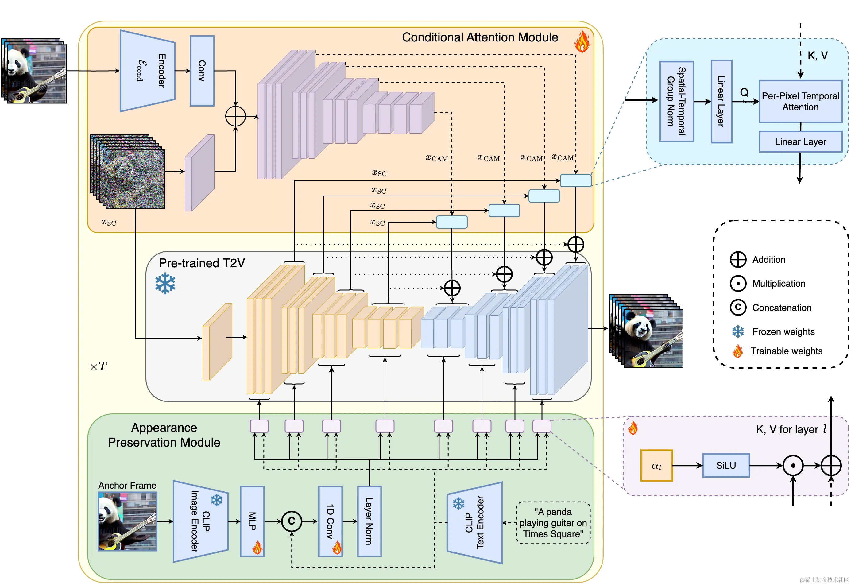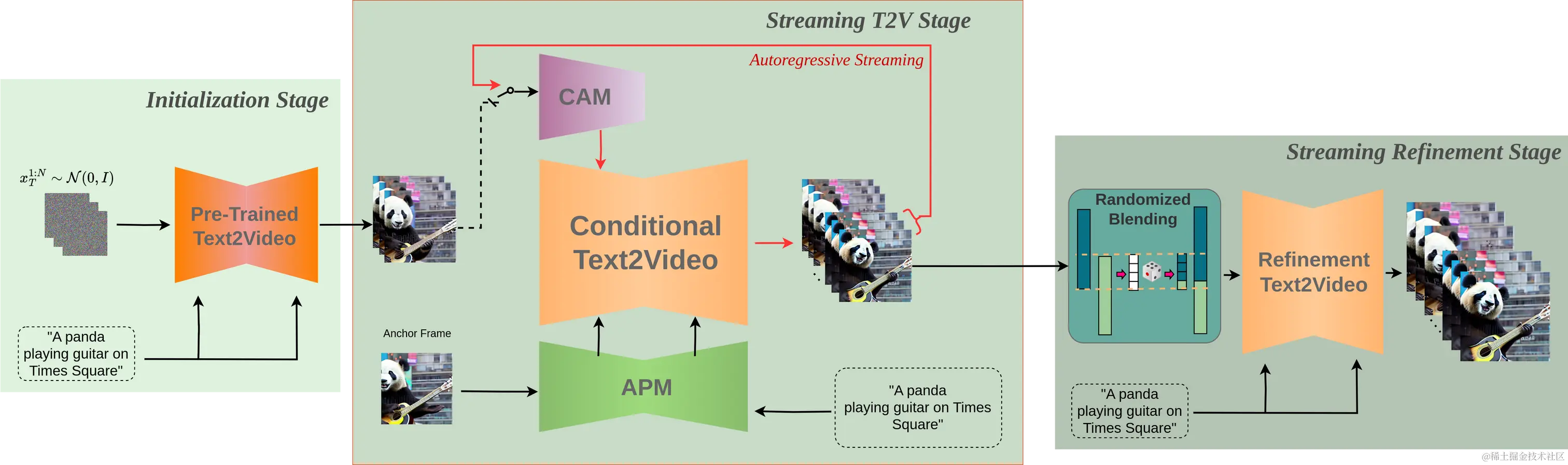 - 条件注意力模块:作为一种“短期记忆”,该模块通过注意力机制从前一个视频块中提取特征,并将其注入到当前视频块的生成中,从而实现流畅自然的块间过渡。
