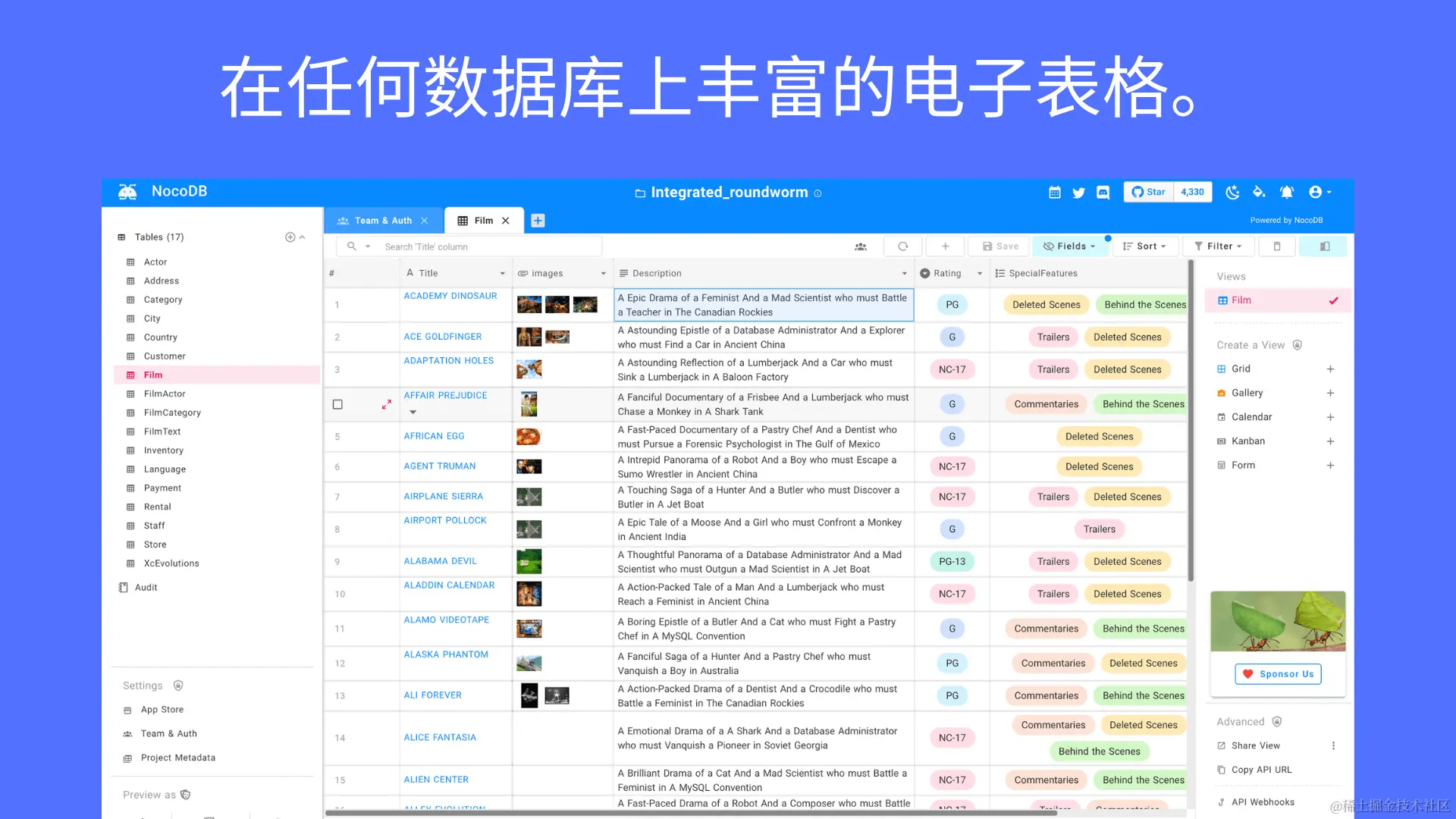 这是知名电子表格-数据库混合体 Airtable 的开源替代品。它可以将 MySQL、PostgreSQL、SQL Server、SQLite 或 MariaDB 转换为智能电子表格,还提供了团队协作、工作流接入以及更加开放 API 服务。
