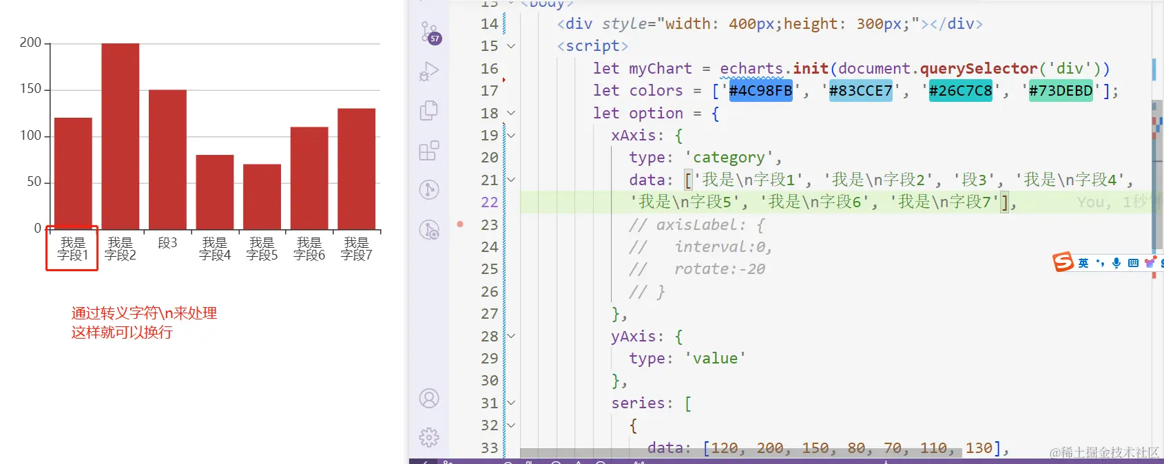 我们可以通过xAxis下的axisLabel下的formatter函数来进行换行,