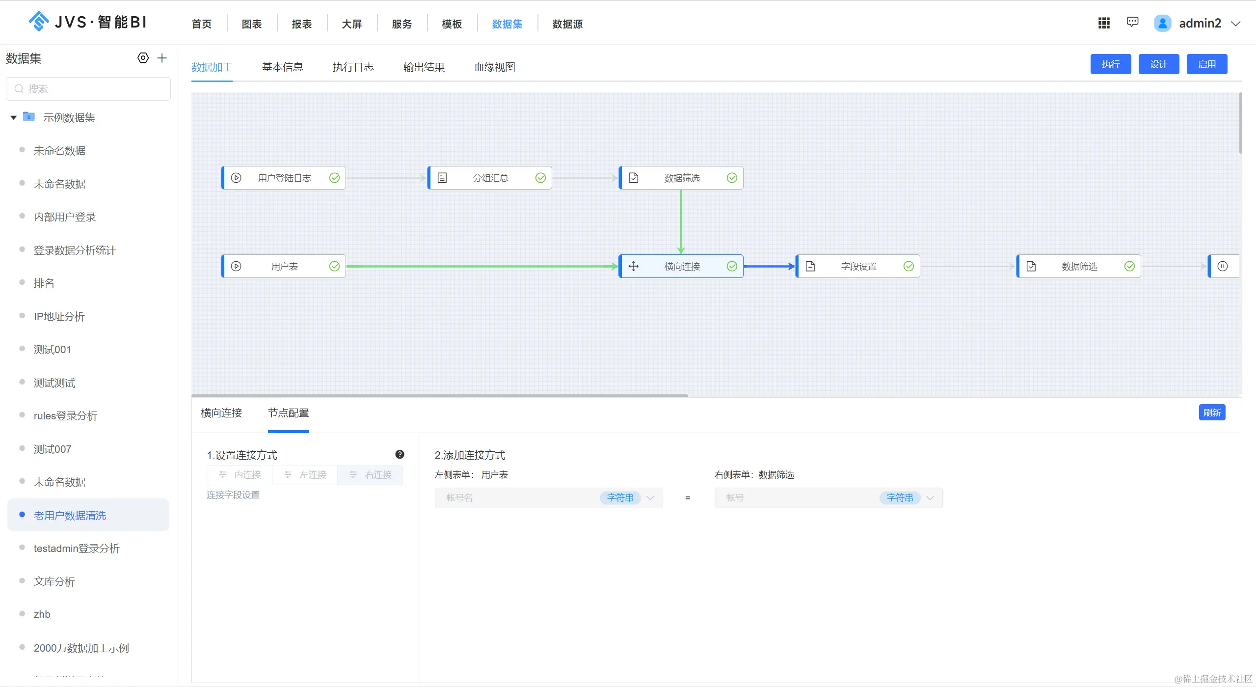 - 流程化加工:基于数仓的离线数据,jvs提供了一个通过界面算子编排的流程处理器,数据的处理和分析是通过一系列数据加工算子,通过分布执行的方式来完成的。这些步骤包括数据的接入、清洗、关联、聚合等,每个步骤都可以通过配置化的方式进行灵活调整和优化。