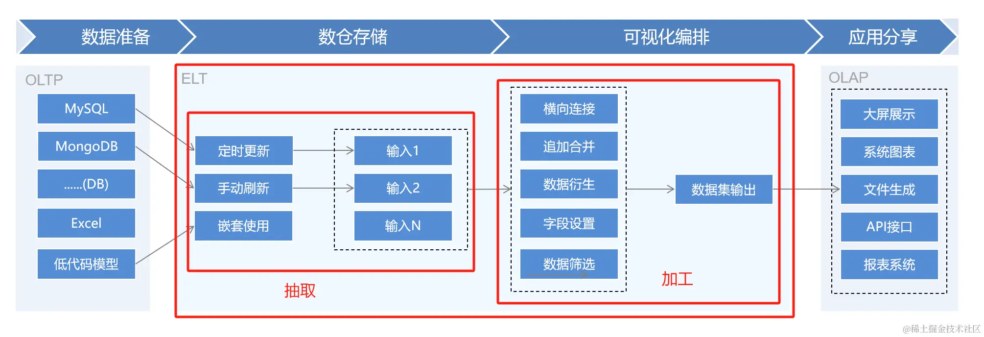 在JVS-BI中采用了数仓+流程化加工的方式进行数据分析,主要涉及到数据的离线抽取,流程化加工,生成标准的数据分析结果。