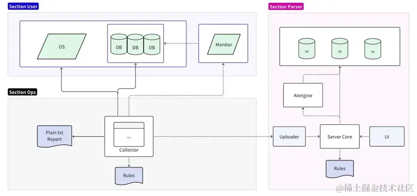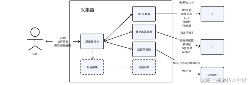 - 采集部分对接目标操作系统/数据库/监控服务器,支持本地规则简化分析,并输出纯文本报告;