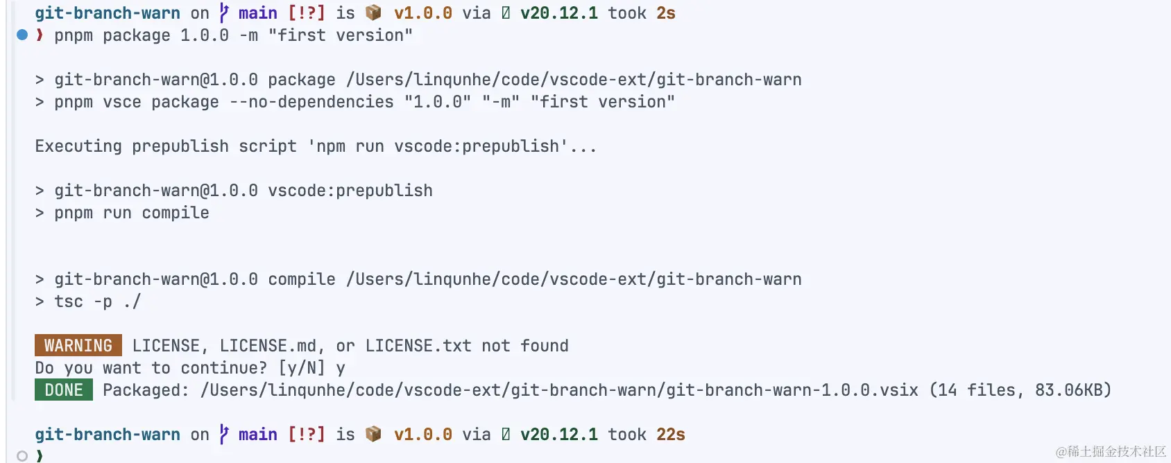 这样就可以打出本地的扩展,可以先自己安装试试有没有问题,然后再 publish 到商店