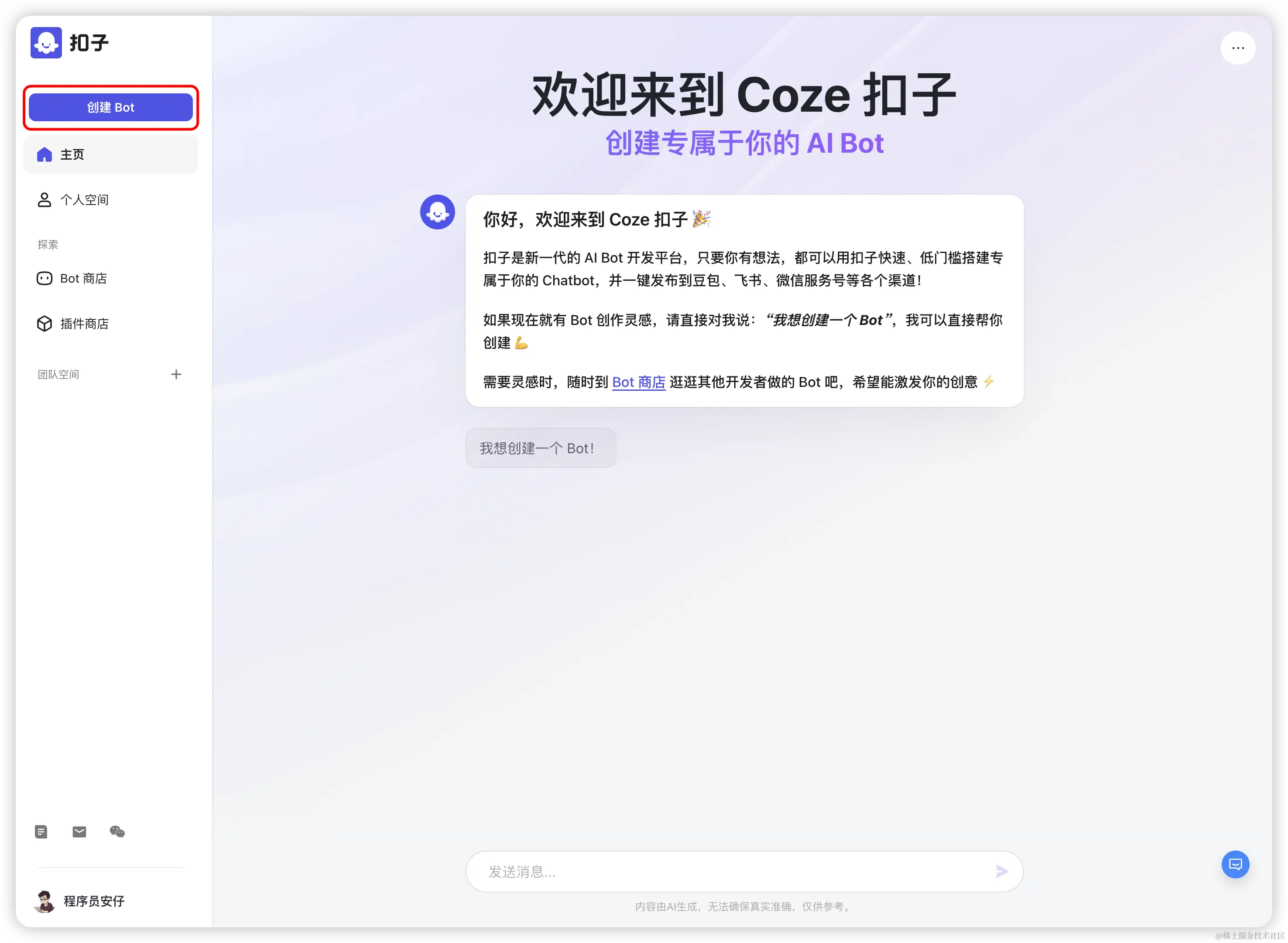 - 首先打开扣子的首页 - www.coze.cn/home,直接点击左上角的创建 AI Bot 按钮: