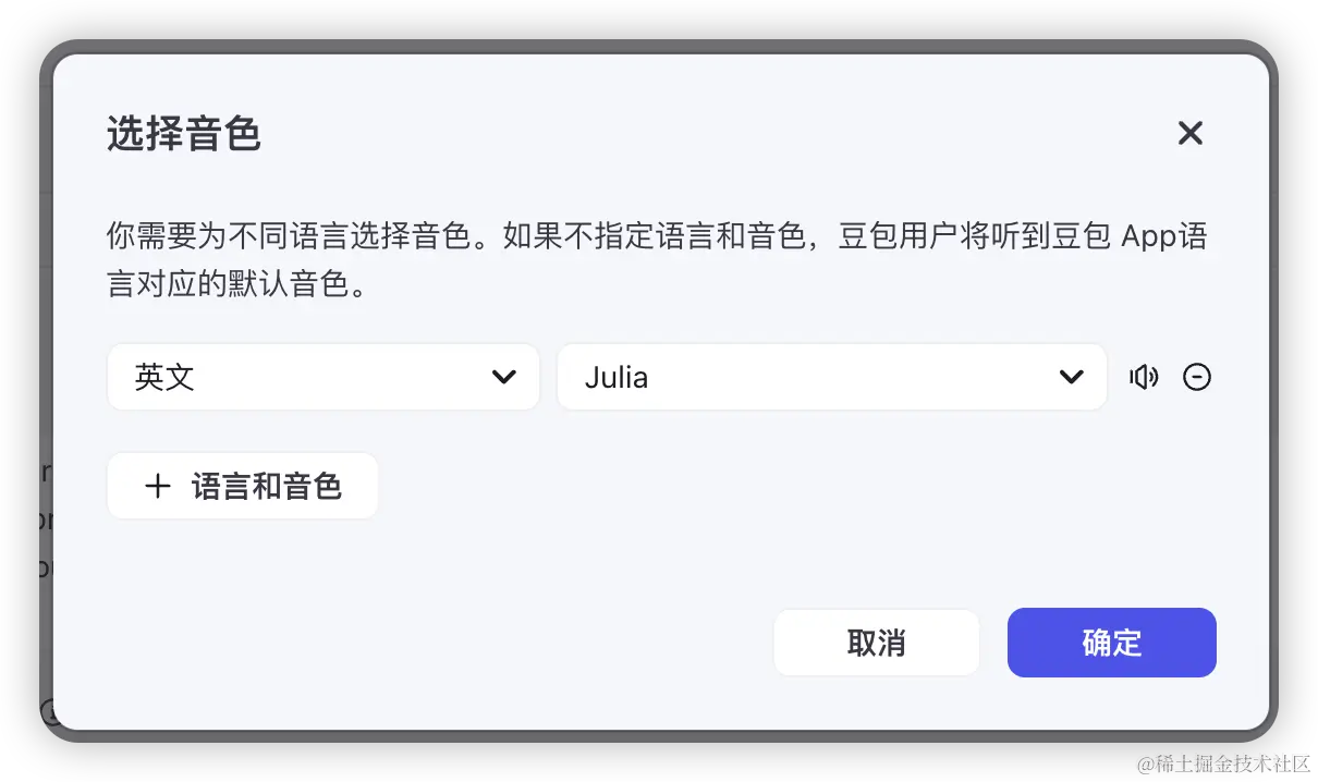 最后,我们来设置一下 AI Bot 的语音,因为是一个英语陪练 AI Bot,所以这里我选择了比较亲切的英语音色,而不是中文音色,这里要注意一下: