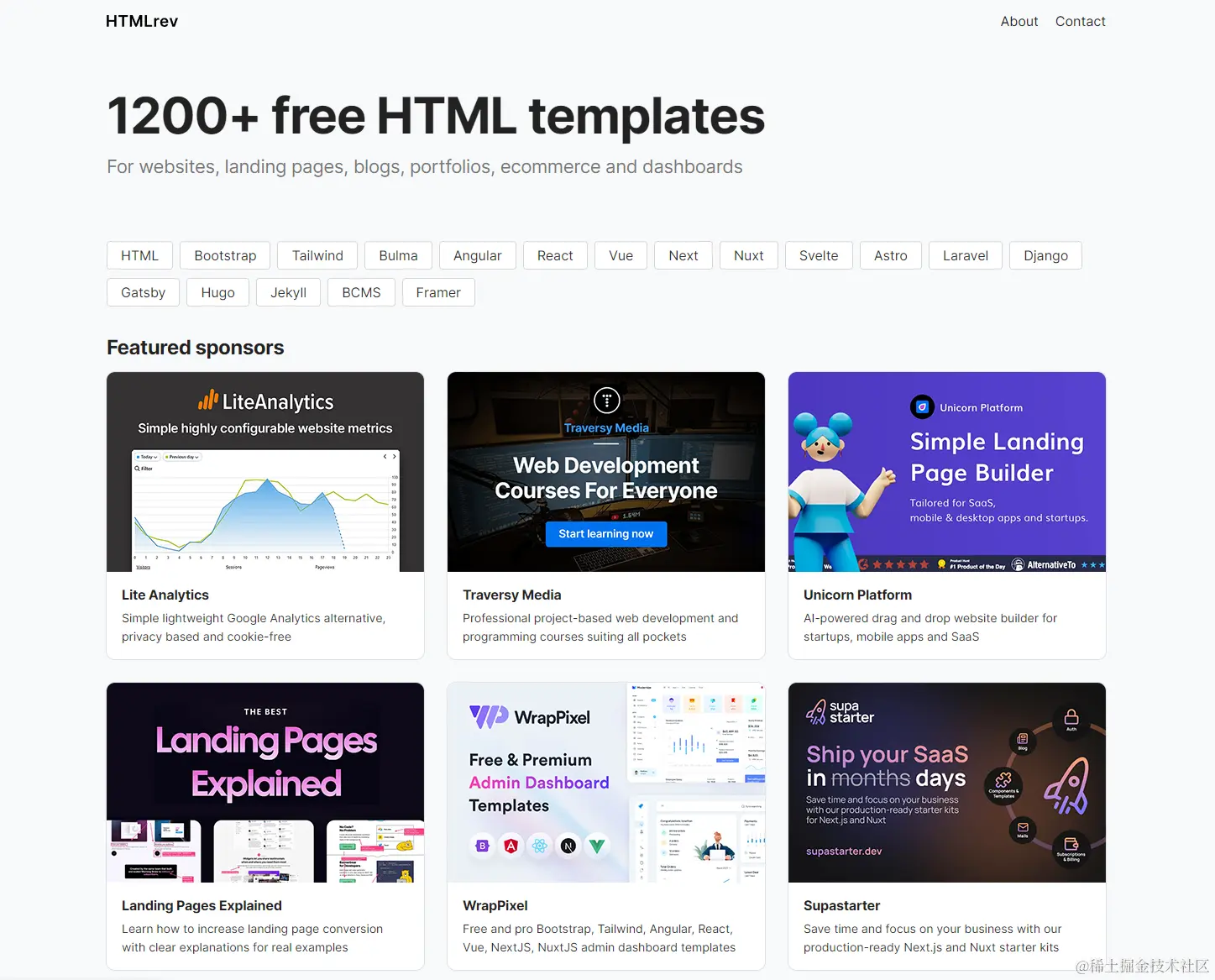 HTMLrev 是一个在线网站,它提供了超过 1200+ 免费的网站模板。这些模板涵盖了各种类型的网站、落地页、博客、作品集、电子商务、仪表盘、后台系统等。