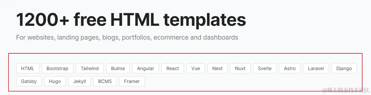 HTMLrev 支持多种技术框架,开发人员可以根据自己的技术选择适合自己开发的模板,目前官方支持的技术有:HTML、Bootstrap、Tailwind、Bulma、Angular、React、Vue、Next、Nuxt、Svelte、Astro、Laravel、Django、Gatsby、Hugo、Jekyll、BCMS、Framer。