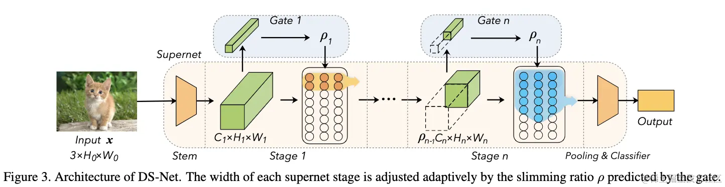 论文提出的dynamic slimmable network通过学习可精简的超网(supernet)以及动态门控(gating)机制,达到根据不同输入样本动态生成网络的目的。如图3所示,DS-Net的超网为包含全部完整卷积的完整网络。动态门控则是一系列预测模块,根据输入动态设定每个阶段的卷积维度,进而生成子网,这一过程也称为动态路由(dynamic routing)。