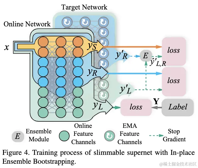 虽然in-place distillation很有效,但最大子网权值的剧烈抖动会导致训练难以收敛。根据BigNas的实验,使用in-place distillation训练较为复杂的网络会极其不稳定。如果没有残差连接或特殊的权值初始化,在训练初期甚至会出现梯度爆炸的情况。为了解决可精简网络收敛难的问题并且提升整体性能,论文提出了In-plcae Ensemble Boostrapping(IEB)方法。