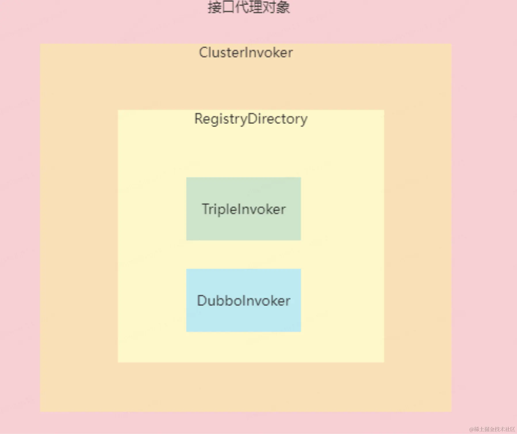 这样 MigrationInvoker 对象中的三个数据就能确定好值了,和在最终的接口代理对象执行某个方法时,就会调用 MigrationInvoker 对象的 invoke,在这个invoke 方法中会直接执行 currentAvailableInvoker 对应的 invoker 的 invoker 方法,从而进入到了接口级 ClusterInvoker 或应用级 ClusterInvoker 中,从而进行负载均衡,选择出具体的 DubboInvoer 或 TripleInvoker,完成真正的服务调用。