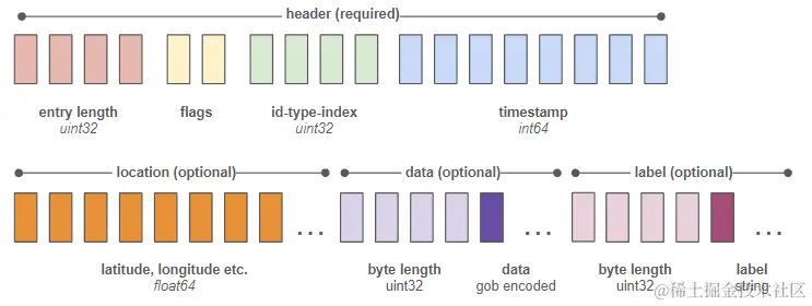 每个块代表一个字节。标记为“flags”的两个字节是一个开关/标识位,包含“是否有纬度”、“是否有经度”、“是否有数据”等信息,告诉解析器在条目的剩余字节中要查找什么。