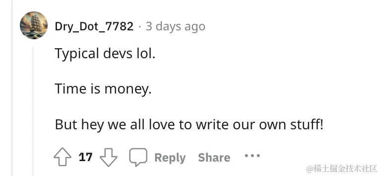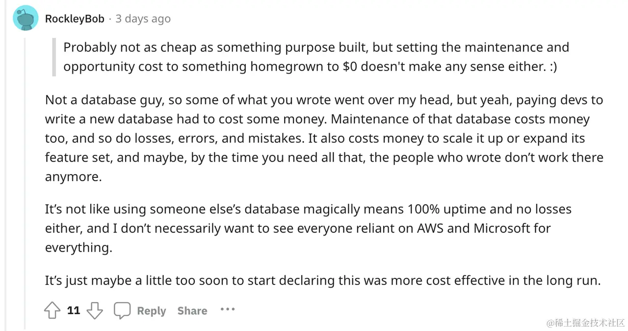 还有网友表示,“尽管你可能对数据库不太了解(扎心),但是雇用开发人员写新的数据库会花不少钱。维护数据库、处理损失、错误和故障也需要花费。而且,随着需要扩展功能,原开发人员可能已经离职了。使用别人的数据库也不意味着百分之百的正常运行时间和零损失。所以现在就宣称这种做法更划算可能还为时过早。”