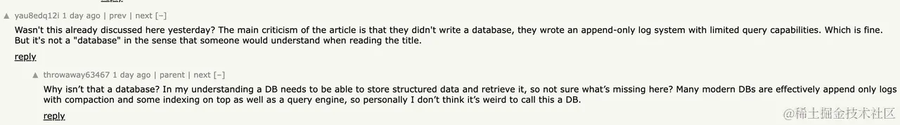 也有网友补充道,“对该文章的主要批评是他们并没有编写一个数据库,而是编写了一个具有有限查询功能的追加日志系统。那么文章叫自建数据库就不合适了。”