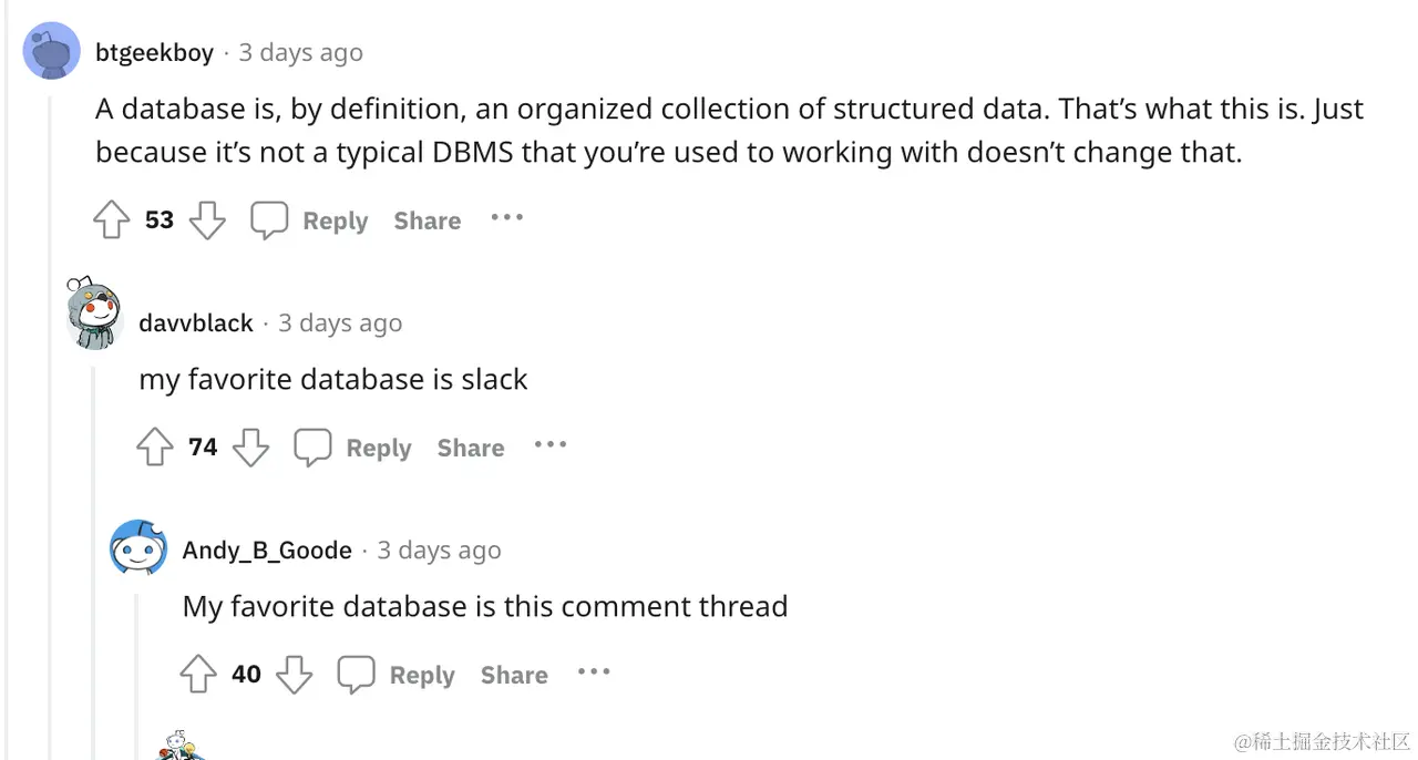 这句话马上遭到了反驳,你要是这么说的话,我最喜欢的数据库是 slack。