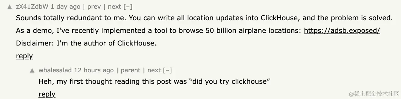 ClickHouse 的作者看到这篇帖子立刻表示,自建的操作略显多余,“可以将所有位置更新写入 ClickHouse,问题就解决了”,并顺便附上了产品 demo(adsb.exposed/)。