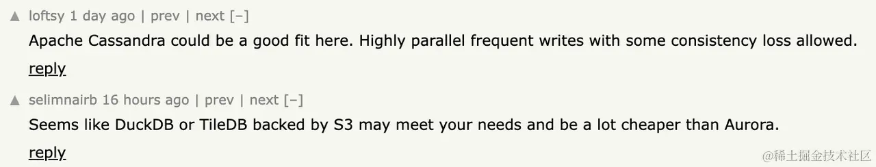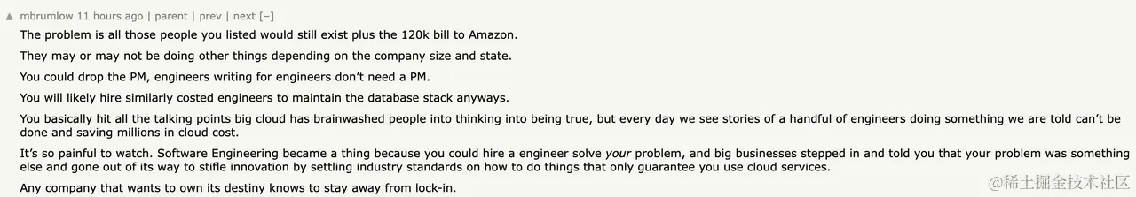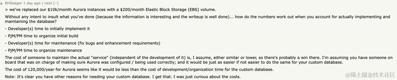 HN 热评榜一大哥也先抛出了类似的疑问,这家公司通过自建数据库,实现了 10k 美元/月到 200 美元/月,这个数据具体是怎么算的?是否将研发投入、项目投入等等成本包含在内?如果没有包含的话,那 12 万美元/年的 Aurora 成本似乎比自定义数据库的开发/组织时间成本要低。