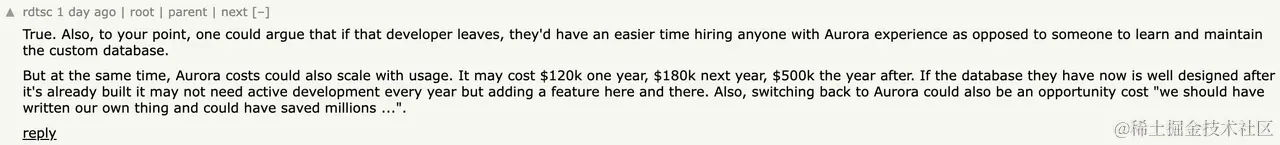 但是也有读者认为,不能将这些费用简单地算在一起,因为一方面 Aurora 每年的使用成本会随着使用量的增加而增加,另一方面一旦自建的数据库开发完成,后续每年所需的成本只是维护费用。而且切换回 Aurora 的机会成本更高。