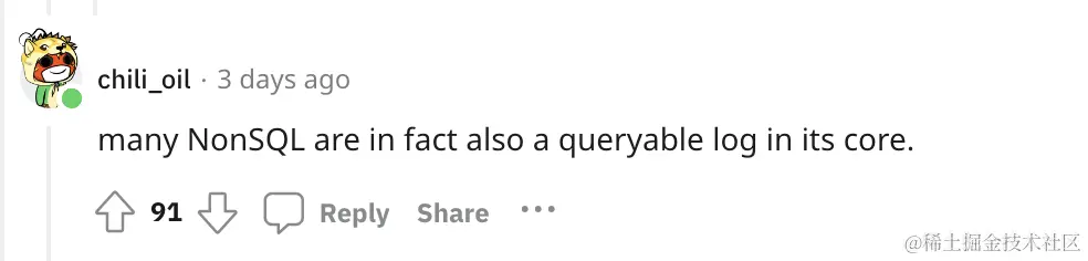 再说了,许多非 SQL 数据库实际上在其核心不也就是是可查询的日志吗。