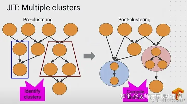 不是所有的TF算子都能够被翻译成XLA的中间表达。那么在图被调度运行时的时候,需要先识别出来在TF计算图中,哪部分可以被转化,哪些不行。能够成功转化的子图被圈选出来,这个过程称为聚类(Clustering)。后续TF运行时在进入子图之前,就会触发JIT编译过程,直接调用编译后的子图代码并缓存起来下次继续用。(计算图中节点大部分都会被多次运行,重复调用、迭代式的计算训练等等)