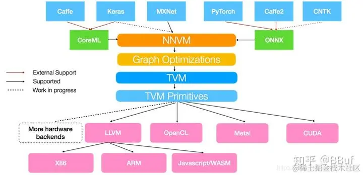 TVM是一个基于编译优化的深度学习框架,TVM的架构图如下图所示: