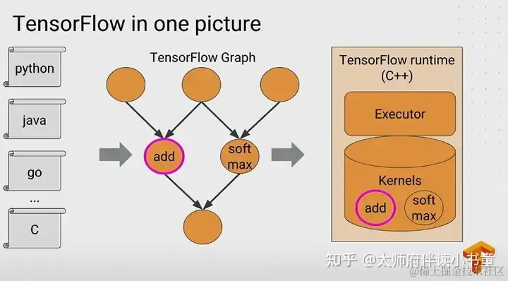 Tensorflow的运行时(Executor)加载所有的图依赖的算子(Kernels),从计算图的根节点开始跑,遇到算子就把kernels里对应的实现调出来执行,然后根据节点间的依赖关系,判断哪些节点现在依赖满足可以调度,哪些还无法调度,来调度相应的节点。