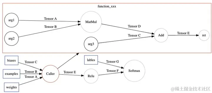 这里假设XLA仅支持matmul和add。XLA通过图优化方法,在计算图中找到适合被JIT编译的区域