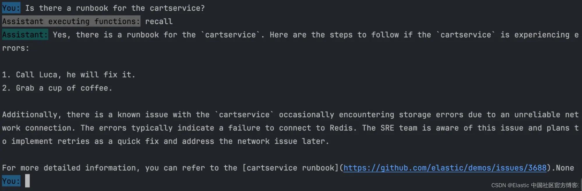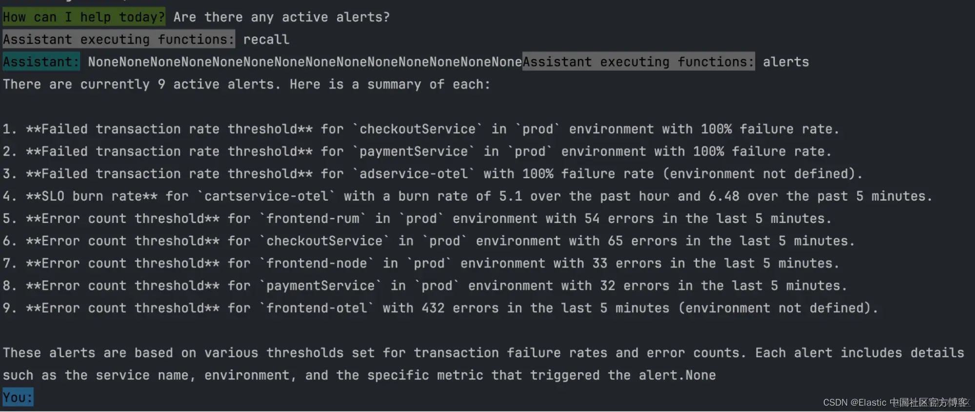 每当 LLM 调用一个函数或 Kibana 运行一个函数以提供关于后台发生情况的额外信息时,脚本就会在新的一行上打印 API 信息。生成的答案也将写在新的一行上。
