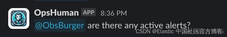 要启动机器人的对话,我们用 “@” 提到 opsHuman,后跟触发命令 shiftstart,然后是我们希望我们的 L1 向 AI 助手提出的问题。