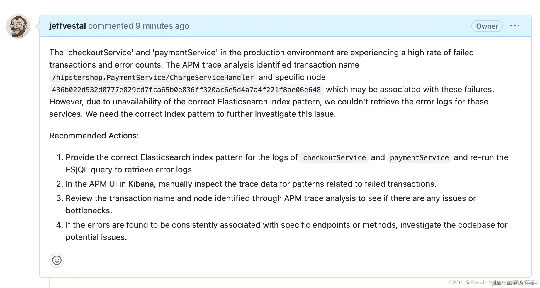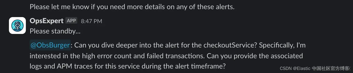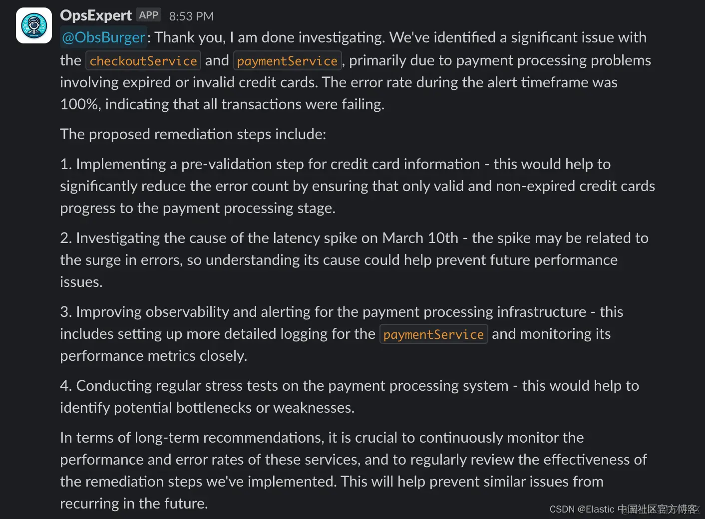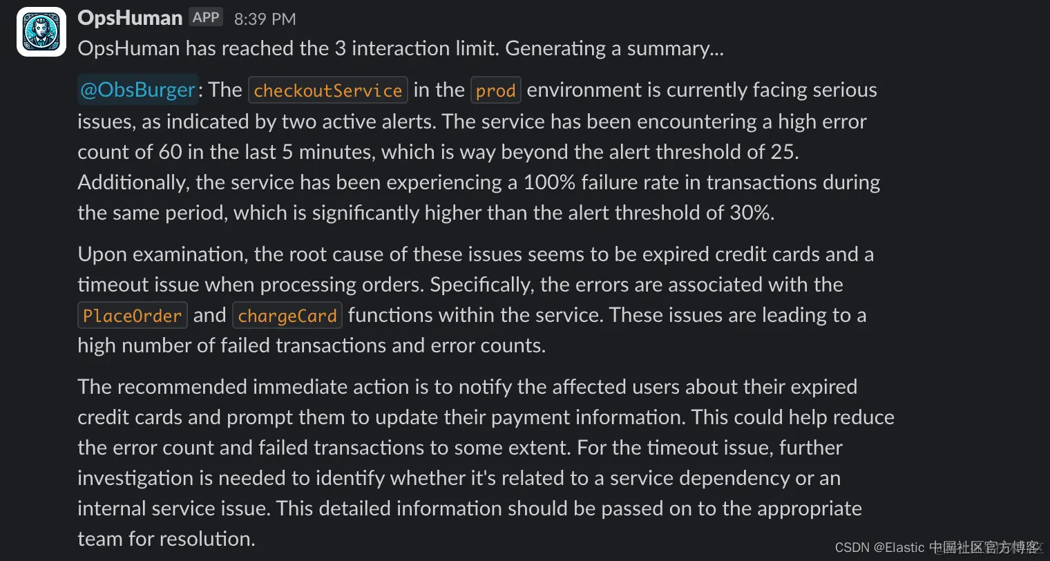 在几次来回请求和交付相关信息后,OpsExpert 得出了与 checkout service 相关的活动警报的结论,并撰写了一份摘要报告。