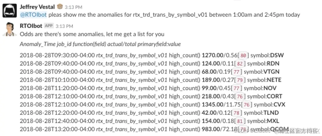 Slackbot 大约 2018 年按袜子符号报告贸易交易的 Elastic ML 异常