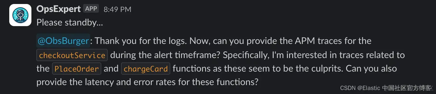 在 opsBurger(AI 助手)提供所请求的信息后,OpsExpert 调查了两个似乎是警报根源的服务。