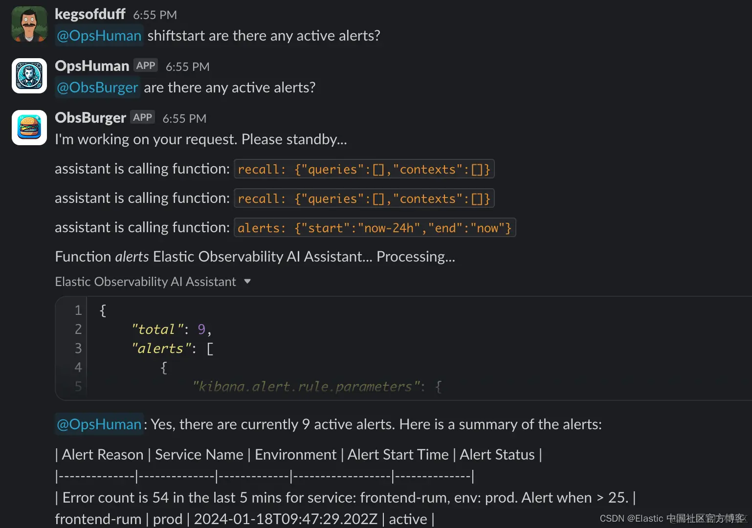 就像在 Kibana 中一样,我可以作为 ObsBurger(AI 助手)获取活动警报列表