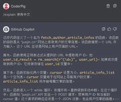 对了,默认使用英文解释,如果需要中文,可以再 /explain 后加个 使用中文: