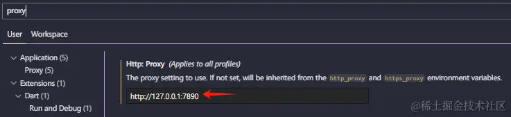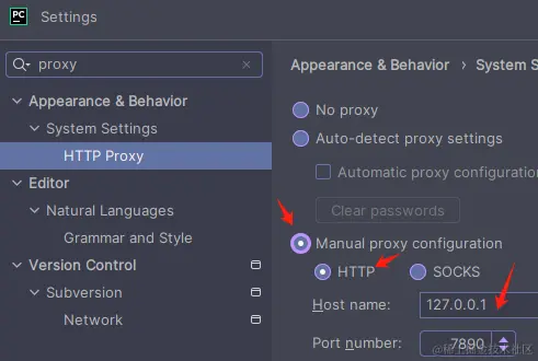 同样需要设置下代理,Settings这里搜 proxy,定位到 HTTP Proxy 选项,在对应位置填写代理地址: