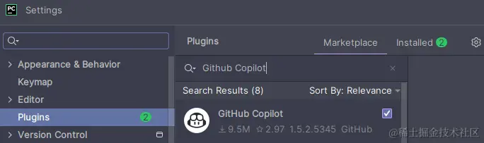 依次点击顶部 File → Settings → Plugins → Marketplace → 搜索 Github Copilot,点击 Install 安装: