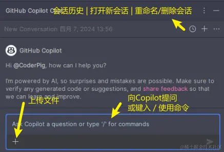 😳 两款IDE上的 Github Copilot Chat 功能有些许不同。命令 是为了在使用Copilot Chat时提供更专业或针对性的帮助与交互。非强制,比如,你用 解释下xxx 代替 /explain 也是可以的!
