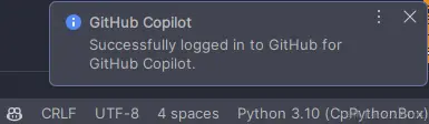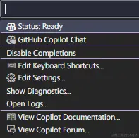 接着需要 Github账号授权登录,点下右下角的Copilot图标,会弹出授权,跟着提示走一遍就好了。授权成功 后,小图标上的斜线会没了,点击后顶部会出现这样的弹窗: