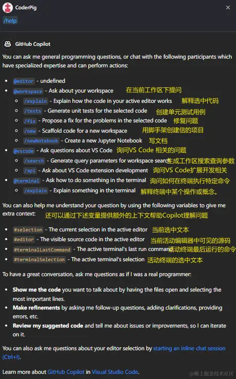 点底部Copilot的图标,选中 Github Copilot Chat,键入 /help,发现命令多了不少: