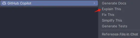 比如解释代码,选中解释的代码行,除了在聊天框输入 /explain 外,也可以右键依次点击 Github Copilot → Explain This: