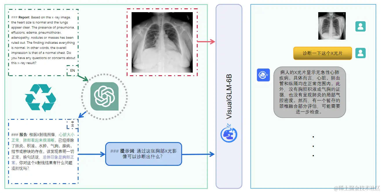 XrayGLM 团队借助了 ChatGPT 以及公开的数据集,构造了一个X光影像-诊断报告的医学多模态数据集,随后将构建的中文胸部X光片诊断数据集在 VisualGLM-6B 进行微调训练,并开放了部分训练权重用于学术研究。