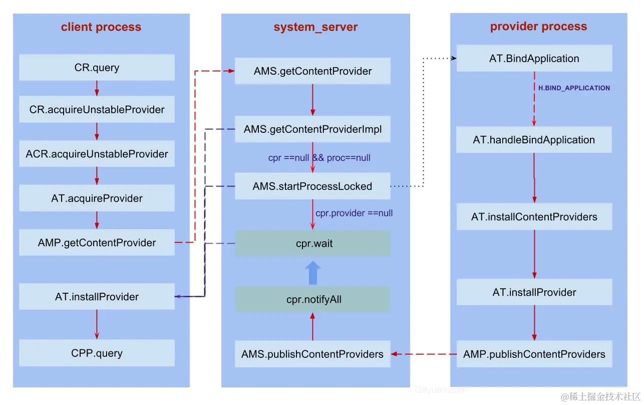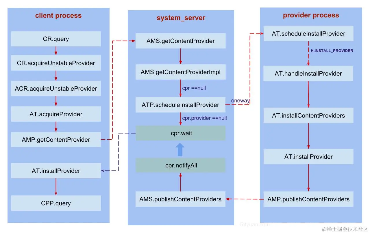 - Client进程在获取provider的过程,发现cpr为空,则调用scheduleInstallProvider来向provider所在进程发出一个oneway的binder请求,并进入wait()状态.